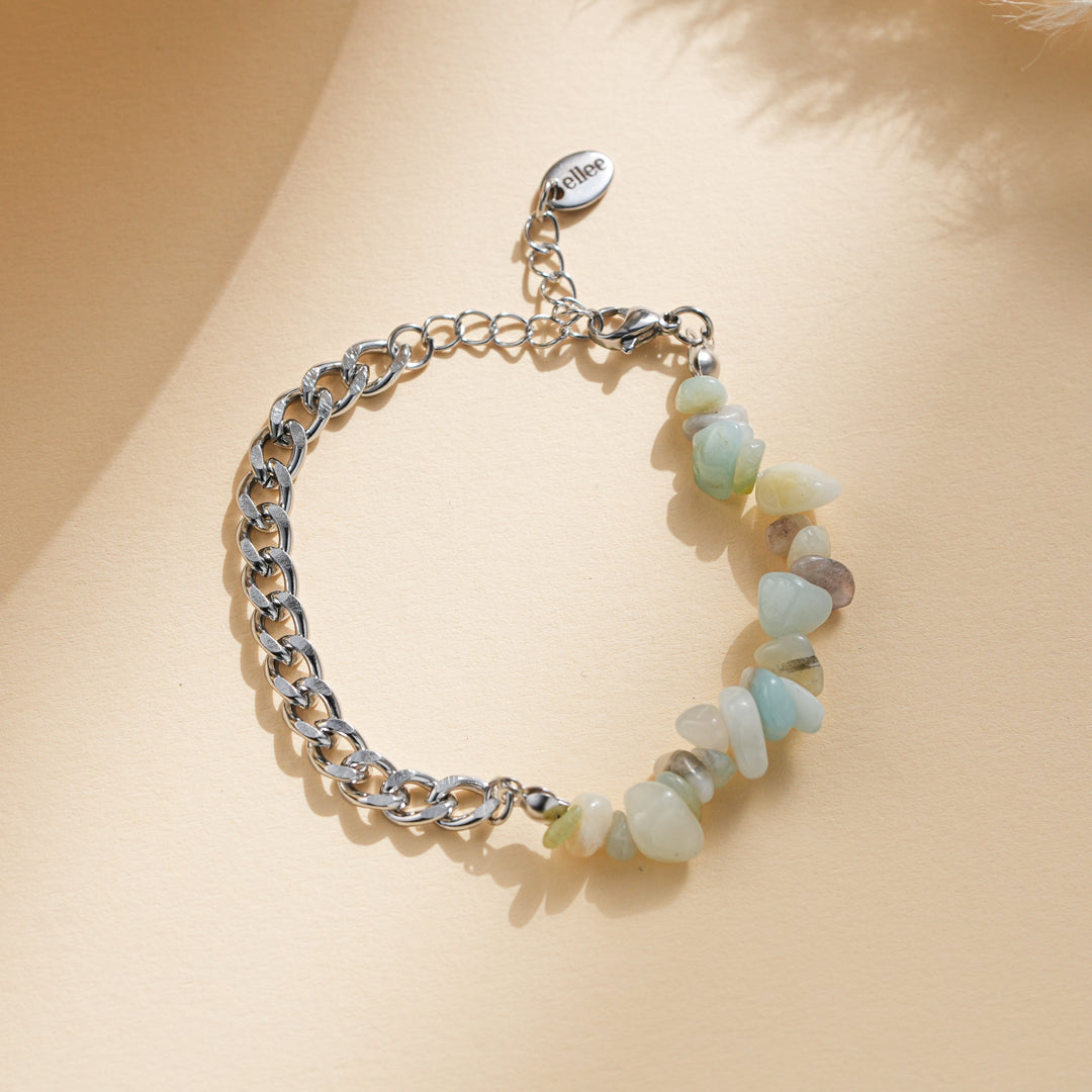 Questo bracciale è un mix perfetto di eleganza e serenità, grazie alla combinazione tra la lucentezza dell'acciaio inossidabile e la bellezza della pietra amazzonite. Il bracciale è composto da una catena in acciaio inossidabile a maglia cubana e da una sezione di pietre amazzonite irregolari, che creano un contrasto cromatico e materico di grande impatto. Chiusura a moschettone, regolabile per adattarsi a diverse misure di polso.