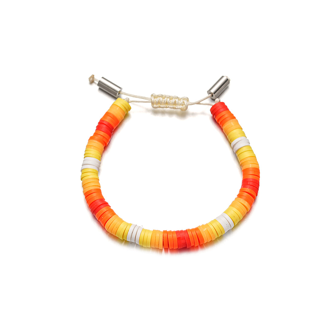 Regala ai tuoi bambini un bracciale colorato e divertente! I dischetti arancioni, gialli e bianchi, come piccole caramelle, porteranno un'ondata di freschezza e allegria nei loro giochi all'aperto. Le tonalità dell'arancione, del giallo e del bianco, ispirate al tramonto, stimolano la creatività e l'immaginazione dei bambini.