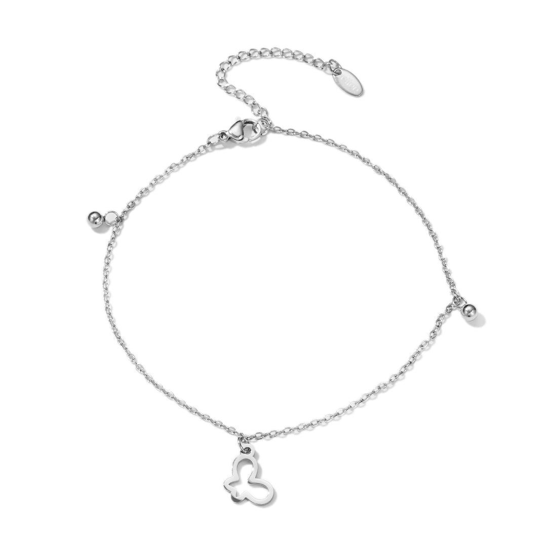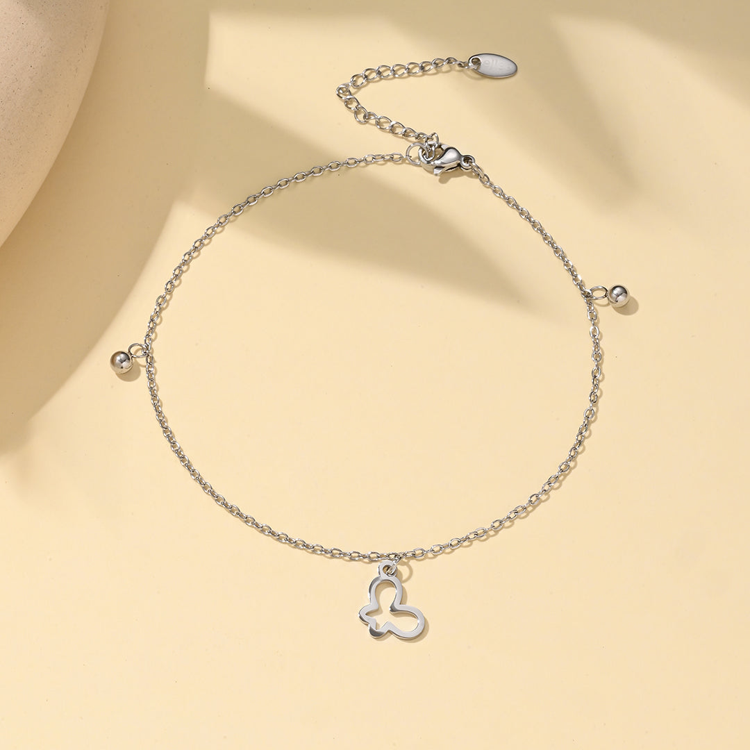 Delicata cavigliera in acciaio inossidabile con un charm a farfalla traforato. Decorata con due piccole sfere decorative, è dotata di chiusura regolabile a moschettone per una vestibilità perfetta. Un simbolo di libertà e trasformazione, ideale per un tocco di grazia.