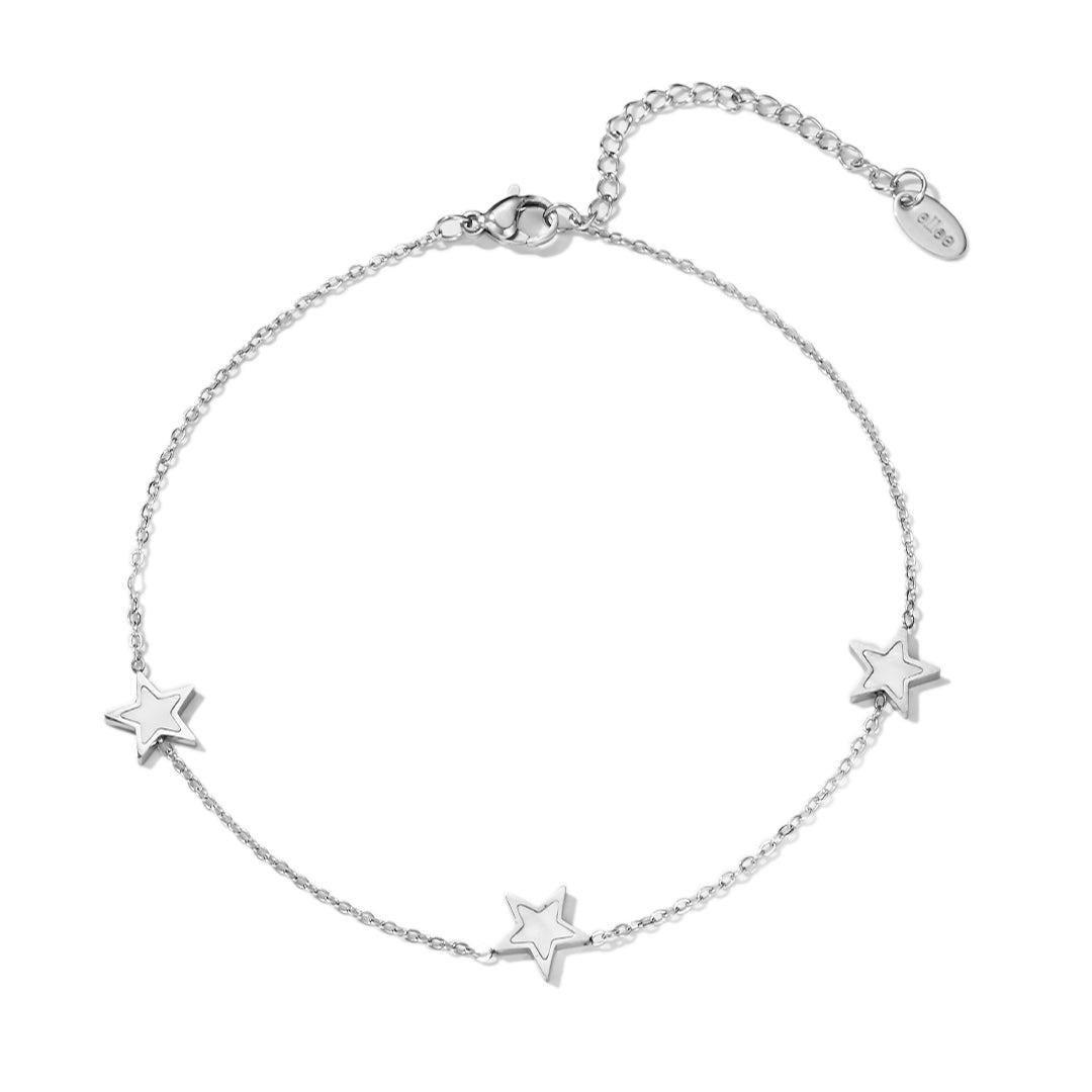 Delicata cavigliera con tre charms a forma di stella tridimensionali. Realizzata in acciaio inossidabile, è dotata di chiusura a moschettone regolabile per una vestibilità perfetta. Un tocco di luminosità e fascino celestiale.