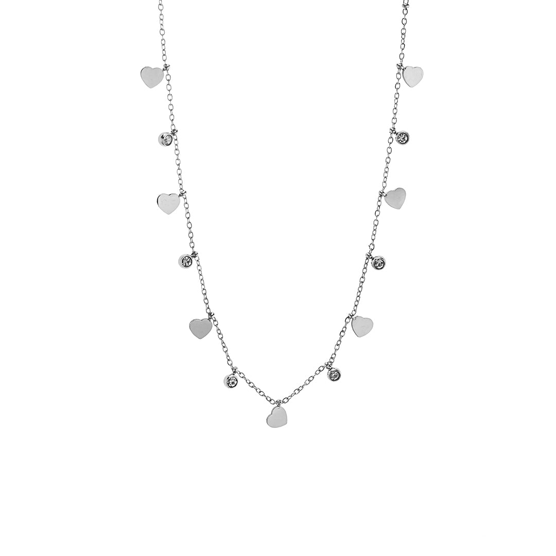 Questa raffinata collana presenta piccoli e delicati cuoricini, simbolo dell'amore e dell'affetto, che si alternano con brillanti zirconi lungo la catenina.