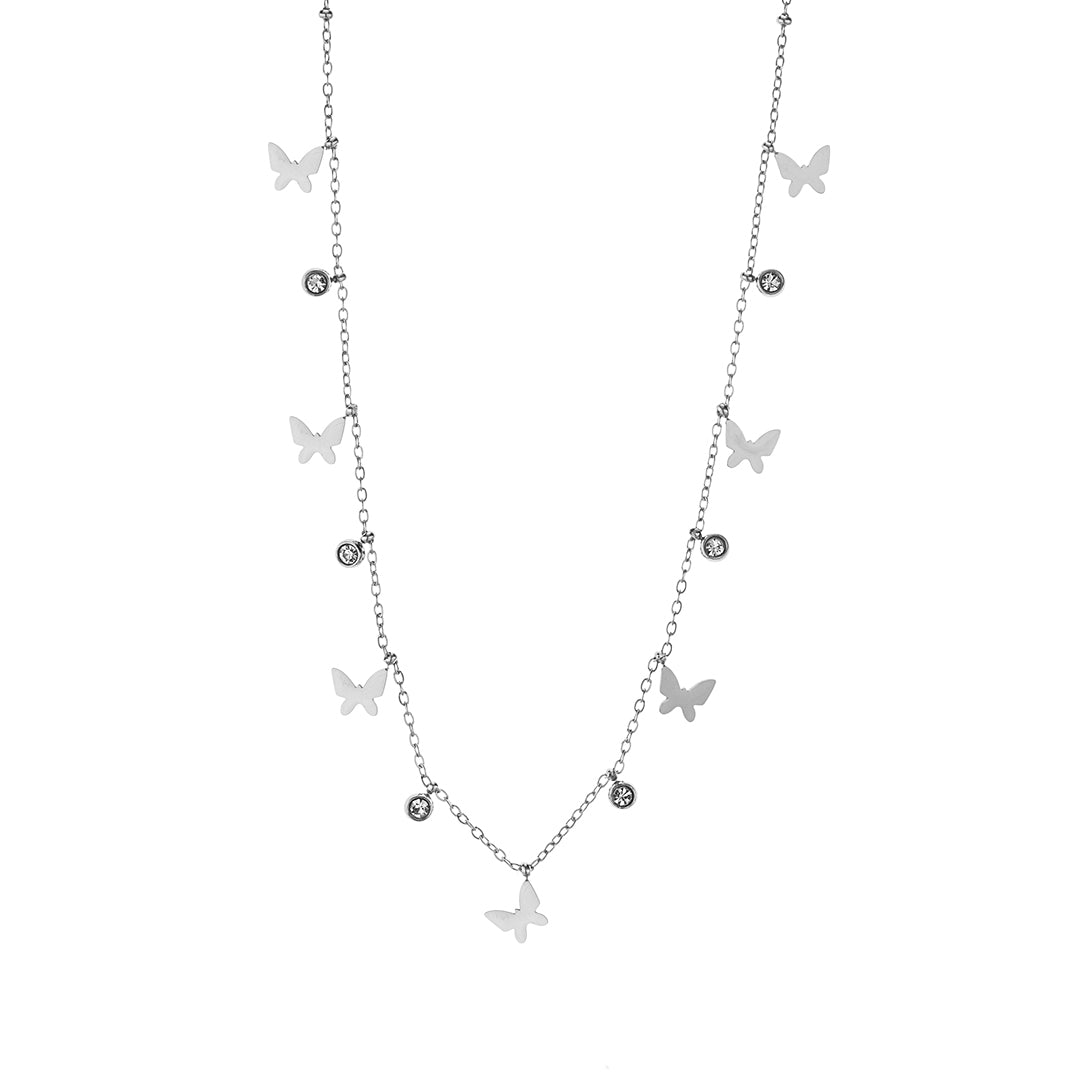 Questa raffinata creazione presenta piccole farfalle, simbolo di trasformazione e leggerezza, che si alternano lungo la catenina con zirconi brillanti, conferendo un movimento armonioso e un fascino etereo.